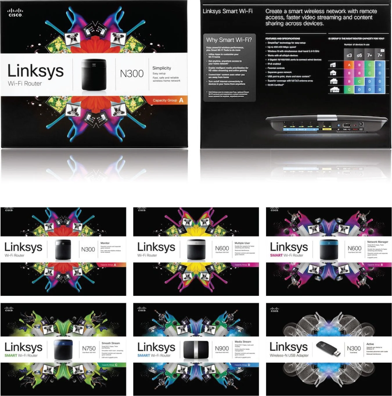 Cisco hired Landor Associates to redesign the packaging for its line of six Linksys WiFi routers, with a kaleidoscope of vibrant visual aids and clearly communicated product capabilities. In this fast, six-month start-to-shelves project, my role was to manage all aspects of production, from building mechanicals to packaging specification, overseeing color proofing and press masters printed in the United States, to coordination and approvals with packaging manufacturers in China.